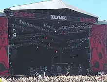 When Download began, it took place on the Donington Park circuit infield as had Monsters of Rock. However, in 2008 developments for Formula One meant that the infield was no longer suitable as a festival site. The festival moved to the "Sunday Markets" site to the west of the circuit. Although adequate, numbers were limited and the location of the campsite meant that getting from tents to the arena was quite a hike. 2009 saw the arena move to a much more suitable location to the south of the circuit and has remained there every year since. In 2019 the capacity was 111,000.[4] Security for the festival has constantly been undertaken by professional crowd management specialists Specialized Security, although the campsite area has had various contractors throughout.