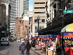 Downtown Crossing is a shopping district within downtown Boston, Massachusetts, located east of Boston Common, west of the Financial District, south of Government Center, and north of Chinatown and the old Combat Zone. It features large department stores as well as restaurants, souvenir sellers, general retail establishments, and street vendors. The Downtown Crossing MBTA station lies in the center of the district.