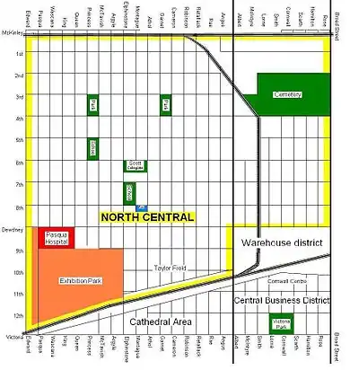 North Central is contained within a trapezium described by the CPR tracks to the south, which divides North Central from the downtown business district; Broad Street to the east; Alexandra Street (two blocks west of Pasqua) to the west; and McKinley Avenue to the north. The increasingly tony Warehouse District being historically a non-residential sector and not part of North Central, is an exception to the generally depressed economic circumstances of the region immediately north of the CPR tracks and is appropriately hived off from the map.