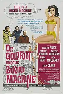 Dr. Goldfoot and the Bikini Machine is a 1965 Pathécolor comedy film directed by Norman Taurog and distributed by American International Pictures. Starring Vincent Price, Frankie Avalon, Dwayne Hickman, Susan Hart and Jack Mullaney, and featuring Fred Clark, the film is a parody of the then-popular spy trend (the title is a spoof of two James Bond films: the 1962 film Dr. No and the 1964 hit Goldfinger), made using actors from AIP's beach party and Edgar Allan Poe films. The film was retitled Dr G. and the Bikini Machine in England due to a threatened lawsuit from Eon, holder of the rights to the James Bond series.