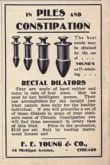 A 1905 advertisement by F. E. Young and Co. of Chicago promised that "The best results may be obtained by the use of Young's self-retaining rectal dilators", the use of which "accomplishes for the invalid just what nature does daily for the healthy individual". Doctors were advised that "If you will prescribe a set of these dilators in some of your obstinate cases of Chronic Constipation you will find them necessary in every case of this kind". The price of a set "to the profession" was $2.50 (equivalent to $80 in 2021).[3]