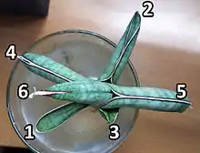 The leaves are typically a light bluish-green colour with regular bands of white. The leaves are also marked by several green longitudinal lines, marking areas where the leaf will fold in on itself during drought, or swell after watering.