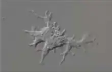 In particular, D. jomungandri exhibits long, tapering thin ramose psuedopdia from all sides of the main cell body when attached to the surface of a culture flask. In this state, its length ranges from 33 to 87 μm long, with a mean length of 57.6 μm, and its width ranges from 3 to 12 μm, with a mean cell body width of 6.2 μm. Its pseudopodia are composed of hyaloplasm while the main body of the cell is made of granuloplasm. It does not form uroids, traces left by some amoebae during locomotion. No cysts have been observed from this species. Upon starvation, it will shrivel up and detach from the surface, and can remain suspended in the water column or float to the water surface.[1]