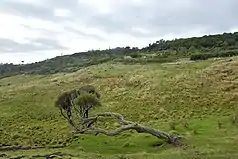Endemic to the Chatham Islands, an island chain around 800 km (500 mi) east of the south Island, it is found on the Chatham, Rangiuria and Rangatira Islands.[2] It is in abundance on the southern tableland of Chatham Island in lowland forests and in the drier regions of swamps, as well as in the transition section between moorland and forest in association D. paludosum–particularly in its juvenile form. On Rangiuria Island, also known by its English name Pitt Island, D. arboreum dominates the upland forest with Rautini (Brachyglottis huntii) and various species of tree ferns.[12][13] It grows from close to sea level to 270 m (886 ft), on cliffs, hillsides, streams, gullies and valley floors. Typical vegetation in these areas is made up of forests, shrublands, bogs and grasslands, whilst the soil content is often boggy and peaty. D. arboreum typically prefers full sun, though will also grow in light shade.[5] The New Zealand Threat Classification System classified it in 2017 as "Naturally Uncommon," giving it an estimated area of inhabitation of 10 km2 (1,000 ha).[1]