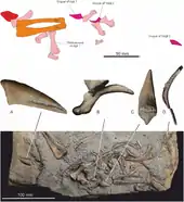 | Skeletal reconstruction, with present bones in green, external moulds in orange, and provisionally identified bones in blue | |