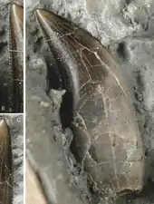 In the front of the snout each praemaxilla embraces the front of a very large nostril. The skull bears three praemaxillary teeth per side and at least seven maxillary teeth. The teeth are recurved or dagger-shaped. The edges of the tooth crown are serrated with six to eight denticles per millimetre (0.03 in). On the trailing edge these serrations run all the way to the root, on the leading edge they end at a higher position. Towards the tip of the tooth, these denticles become gradually somewhat smaller. The maxilla borders an antorbital fenestra with a shallow depression. The jugal is a slender element with a straight lower edge, a thin front branch overlapped by the rear branch of the maxilla and an ascending process towards the lacrimal that is thin but not pointed. The lacrimal is rectangular and pinched in the middle.[3]