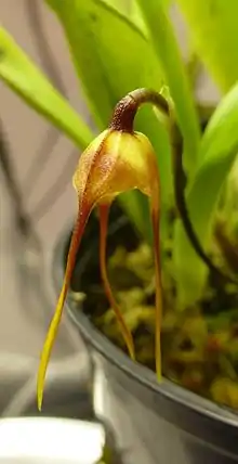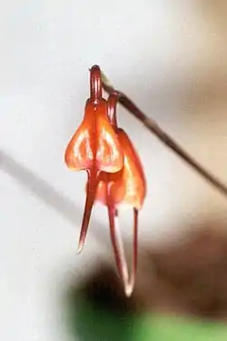 The orchid genus Dracula, abbreviated as Drac in horticultural trade, consists of 118 species native to Mexico, Central America, Colombia, Ecuador and Peru.[1] The name Dracula literally means "little dragon", an allusion to the mythical Count Dracula, a lead character in numerous vampire novels and films.[2][3] The name was applied to the orchid because of the blood-red color of several of the species, and the strange aspect of the long spurs of the sepals.[4] The plants were once included in the genus Masdevallia, but became a separate genus in 1978. This genus has been placed in the subtribe Pleurothallidinae.