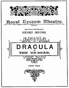 In 1924, the British producer Hamilton Deane premiered a stage version of Dracula at the Grand Theatre in Derby, England.[3] This version of the play was a modernized retelling of Stoker's story.[3] The play's success led to Deane taking it on tour for the next three years.[3] The play opened in London's Little Theatre on 14 February 1927, where it was sold well while not being critically well received.[3] After seeing the play in London, American producer Horace Liveright bought the rights to the for Broadway, and hired John L. Balderston to Americanize the Deane's text.[3][4] The Broadway version featured actors who would later be cast into the Universal film, including Bela Lugosi as Dracula, Edward Van Sloan as Prof. Van Helsing, Herbert Bunston as Dr. Seward.[5][3] Dracula opened at New York's Fulton Theatre on 5 October 1927, where it ran for 265 performances finally closing in New York in May 1928.[3] Gary Don Rhodes described the play as "taking America storm", a statement backed up by a 1930 article in the Chicago Tribune claiming that the play "has been rolling around the country ever since its first vogue two or three seasons ago, coaxing money into box offices that had abandoned hope of the drama, and of the shriek-and-shudder plays of the last five years it easily leads the list."[6][7]