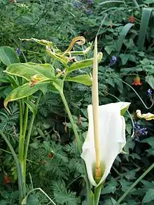 Dracunculus is a genus of two species of a tuberous perennial of the family Araceae. They are characterised by a large purple spathe and spadix, often produced in advance of the pedate, dark green leaves often with white mottling. The open spathe is usually accompanied by a foul smell.