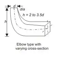 - Elbow with varying cross section – It is similar to the Bent Draft tube except the bent part is of varying cross section with rectangular outlet.the horizontal portion of draft tube is generally inclined upwards to prevent entry of air from the exit end.[2]