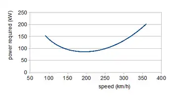 The extra factor of V/η, with η the propeller efficiency, in the second equation enters because PR= (required thrust)×V/η. Power rather than thrust is appropriate for a propeller driven aircraft, since it is roughly independent of speed; jet engines produce constant thrust. Since the weight is constant, the first of these equations determines how CL falls with increasing speed. Putting these CL values into the second equation with CD from the drag curve produces the power curve. The low speed region shows a fall in lift induced drag, through a minimum followed by an increase in profile drag at higher speeds. The minimum power required, at a speed of 195 km/h (121 mph) is about 86 kW (115 hp); 135 kW (181 hp) is required for a maximum speed of 300 km/h (186 mph). Flight at the power minimum will provide maximum endurance; the speed for greatest range is where the tangent to the power curve passes through the origin, about 240 km/h (150 mph).[6])