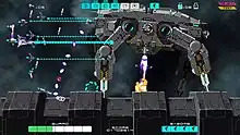 A key gameplay mechanic to Drainus is its "reflector" system,[2] which is reminiscent of Giga Wing and Ikaruga:[3][4] The player can press a button at any time to activate a guard shield for a brief time period and absorb purple enemy shots to launch counterattacks depending on how many projectiles were absorbed, and can be deactivated in order to recharge it. However, wrong use of the reflector shield will lead the player taking damage from enemy fire, while certain projectiles cannot be absorbed.[2][3] The player can also adjust the ship's overall speed by holding down the trigger button.[2] When shot down, enemies drop energy tanks that act as currency to enhance or change various functions of the ship via an upgrade system accessible by pausing the game.[2][3] The ship is also equipped with bombs capable of obliterating any enemy caught within its blast radius.