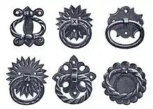 A drawer pull often includes a plate to which the handle is fastened. The handle may swing from one or two mounts ("drop handle" or "swing handle"), making a drop drawer pull. A bail handle is a kind of swing handle consisting of an open loop attached to two mounts. The handle may also be fastened to the plate with rivets, making it immovable. The plate may be ornamented by piercing, embossing, or both. The ornament may also be cut on the surface with tools, leaving it sunken into the metal. The stock for handles may be round, rectangular, or irregular forged shapes.[3]