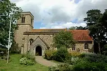 The Church of England parish church of the Holy Trinity contains fragments of 12th-century masonry.[4] The first known documentary record of the parish church is from 1232.[3] The chancel was rebuilt in the 14th century[4] in the Decorated Gothic style. In the 15th century the nave was rebuilt and the west tower was built or rebuilt in the Perpendicular Gothic style.[4] Of the same period are the Perpendicular Gothic hexagonal baptismal font,[5] the three-light east window of the chancel, a 15th-century alabaster relief above the altar depicting the Crucifixion of Jesus and fragments of 15th-century stained glass in the windows.[4] In the 16th century the south porch was added.[4] In 1863 the church was restored and the chancel was extended about 6 feet (2 m) eastwards, re-using the Perpendicular east window in the new position.[3] Holy Trinity is now a Grade II* listed building.[4]