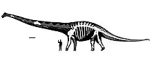 Estimates based on measurements of the known parts of the skeleton suggest that the only known individual of Dreadnoughtus schrani was approximately 26 metres (85 ft) long and stood about 2 stories tall.[4] At 1.74 m, its scapula is longer than any other known titanosaur shoulder blade.[4] Its ilium, the top bone of the pelvis, is also larger than any other, measuring 1.31 m in length.[4] The forearm is longer than any previously known from a titanosaur, and it is only shorter than the long forearms of brachiosaurids, which had a more inclined body posture.[4] Only Paralititan[19] preserves a longer humerus (upper arm bone). Although each species likely had slightly different body proportions, these measurements demonstrate the massive nature of Dreadnoughtus schrani.[4] The estimated mass of the type specimen is about 48–49 metric tons (53–54 short tons).[12][18]