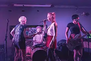 Dream Wife are an English, London-based band, whose sound is a mixture of punk rock, pop music and indie rock.[3][4][5] The band consists of Rakel Mjöll (lead vocals), Alice Go (guitar, vocals), and Bella Podpadec (bass, vocals).[6] They have been supported by Alex Paveley on drums since 2018.[7][8]