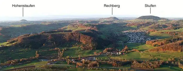 The Drei Kaiserberge (lit. three emperor-mountains) Hohenstaufen (684 meters), Rechberg (707 meters) and Stuifen (757 meters) are inlier mountains of the Swabian Alb in Baden-Württemberg, Germany. They form a distinctive group between Göppingen and Schwäbisch Gmünd and are a widely visible and prominent feature of the region. Since 4 October 1971, they have been protected together with Aasrücken and Rehgebirge as a Landschaftsschutzgebiet (landscape conservation area).[1]