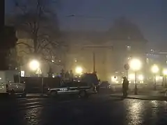 The first police car was called to the building at 4:59 a.m. arriving five minutes later,[1] but by that time the suspects had escaped.[18] The police set up roadblocks on the outskirts of Dresden in an attempt to prevent the suspects from leaving.[18] However, according to police, the museum's proximity to the autobahn is likely to have helped the suspects' escape.[18] The police believe there were four thieves and that they fled in an Audi A6; an identical vehicle was later found on fire in an underground parking lot.[1] Police offered a €500,000 reward for information which could lead to the capture of the perpetrators.[12]