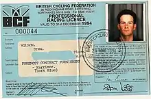 ![]() Drew Wilson's race licence from 1994 | |