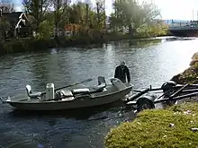 A Drift Boat is an evolution of the open-water dory, converted for use in rivers. The design is characterized by a wide, flat bottom, flared sides, a narrow, flat bow, and a pointed stern. A Rocker is used along an arc from bow to stern along the bottom of the boat. It is this constant rocker that allows the boat to spin about its center for ease in maneuvering in rapids.[1]