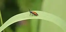 Adult males are approximately 10 millimetres (0.39 in) long. They have long comb-shaped antennas, probably utilized for detecting pheromones of females. Head and pronotum are black, while elytra are reddish, quite soft and covered of fine upstanding hairs.