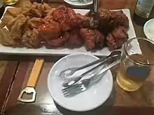 Koreans have strict rules of etiquette in drinking alcoholic beverages. When receiving a glass from an elder, one must hold the glass with two hands (left palm at the bottom and hold the glass with the right hand) and bow the head slightly. When it is time to drink, the drinker must turn away from the elder, and cover the mouth and glass with their hands. The first drink must be finished in one shot. When the glass is empty, the drinker hands it back to the person who poured the drink for them and the drinker then pours them a shot. This starts a series of glass and bottle passes around the table.[10][11][12]