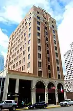 The hotel opened with 60 rooms including 12 corner rooms with attached baths, a rare feature in hotels of the region at the time. At the center of the hotel was a four-story open rotunda capped by a domed skylight, which functioned as a flue to suck up the hot air and cool the building; the skylight was removed when air conditioning was installed on the roof in 1950.[6] The building was designed for separate entrances for men and women. Two entrances, one on Sixth Street and another facing the alleyway on the west side the building, were reserved for men and were flanked by a saloon, billiard room, cigar shop, a newsstand and a barbershop featuring baths. The women's entrance on Brazos Street allowed female guests to proceed directly to their rooms, thereby avoiding the cigar smoke and rough talk of the cattlemen in the lobby.[8] The second floor contained the main dining room and ballroom, separate parlors for men and women, a children's dining room, and bridal suites.[6] Other embellishments included an electric bell system, marble bureaus, steam heating, and gas lighting.[9]
