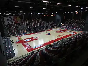 The building has an area about of 6,600 square metres (71,000 sq ft) and is accessible for the disabled. The hall has 3,504 seats,[1] 300 of which are collapsible to allow the facility to host volleyball and handball games.
