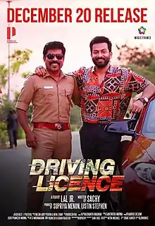 Driving Licence is a 2019 Indian Malayalam-language comedy drama film directed by Lal Jr, written by Sachy and produced by Prithviraj Productions and Magic Frames. It stars Prithviraj Sukumaran and Suraj Venjaramoodu. The story follows film actor Hareendran who wants a driving licence urgently and his ardent fan, Motor Vehicle Inspector Kuruvila Joseph, agrees on delivering it illegally, but their rendezvous does not go well, on the contrary, a feud develops between them that takes a toll on each other's personal and professional lives.
