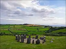 The most westerly stone (1.9m long) is the long recumbent and has two egg shaped cup-marks, one with a ring around it.[3] An axial stone circle, also known as a "Cork–Kerry type" stone circle, it is flanked by a pair of 1.8m high axial portal stones, which mark the entrance to the stone circle, and face the recumbent altar stone.[6] This arrangement creates a south-west axis, and orients the monument in the direction of the setting sun during the midwinter solstice.[7][2][5]