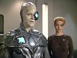 The Borg are a Star Trek villain species famous for their phrase, "resistance is futile." TV Guide named the Borg at number 4 in its 2013 list of the 60 Nastiest Villains of All Time.[2] The Borg were introduced on Star Trek: The Next Generation in the episode "Q Who?" (S2E16) and also featured in the critically acclaimed episode "The Best of Both Worlds".[3] They made a major influence on Voyager starting with "Scorpion", which introduced the ex-Borg character Seven of Nine to the main cast, and there were many Borg-centric episodes since that time; they return with a major story once again in Drone.[4]