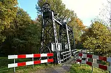The early twentieth century sluice is a beautiful riveted iron structure. It was operated by two big wheels that are connected via cogwheels and chains to two axels high up. These move the doors, that have heavy counterweights to ease operation. On the canal side are some more modern parts. The sluice was tendered in December 1910[39] In March 1911 preparations were made for constructing a culvert at the site.[40]