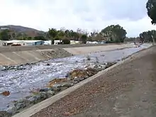 The vertical hard basin drop structure, also called a dissipation wall, is the basic type of drop structure. The vertical hard basin drop consists of a vertical "cutoff wall", usually built of concrete, that is usually laid perpendicular to the stream flow; and an impact basin, not unlike a stream pool, to catch the discharged water. The purpose of the vertical hard basin drop is to force the water into a hydraulic jump (a small standing wave). Though the simplest type of drop structure, it is highest in maintenance needs and less safe, with most problems related to the impact basin. Sediment is often deposited in the basin, requiring frequent removal, and erosion downstream of the base of the structure.[1] Understanding the estuarine turbulent flow from dams, channels, and pipes, as well as the river flow are very important due to the potential to cause damage to the bed of the river or channel and cause scouring of structures such as the saddles of bridges, because of the huge amount of the kinetic energy carried by the flow. One of the most efficient yet simple ways to dissipate this energy is to install a stilling basin at the discharge point to calm the flow.[2]