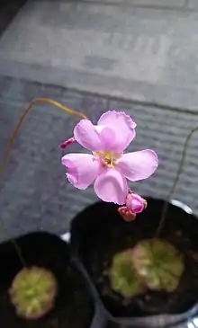 This sundew will flower several times from spring to fall if given proper environmental conditions.[4] The flowers of D. admirabilis sit on top of a 20–30 cm stalk which bend horizontally as each flower opens. Only one flower usually opens each day, opening up early in the morning, and is fully closed by the last light of the day. Its flowers are typically 1 cm in diameter with five light-violet petals and ten yellow anthers in the center, surrounded by six light-violet stigmas.