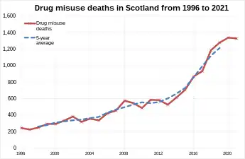 Scotland has the worst drug-related/misuse mortality rate in Europe[3] and in the UK as a whole.[3] It is 3.5 times higher then England and Wales.[3] In 2021, a total of 1,330 people died from drug-misuse.[3][4]