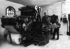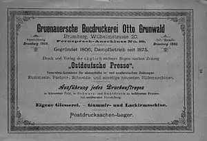 The printing house employed 75 people in 1831, 136 in 1896 and reached 230 employees just before World War I.[1] Despite many ownership changes, the plant was still called Printing House Gruenauer in 1920 (German: Grunauerische Buchdruckerei).