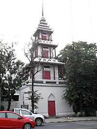 Nearby there is also a Clock Tower (Thai: หอนาฬิกา). It is a replica of the clock tower built up to replace the first clock tower in Bangkok that used to be in the nearby Grand Palace during the King Rama IV's reign, it was built with the drum tower restored in 1982 on the occasion of the 250th anniversary of the Rattanakosin (present-day Bangkok).[3] 13°44′47.84″N 100°29′40.17″E