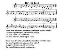 "Drum bun" (transl. "Farewell") is a Romanian march composed by Ștefan Nosievici[1] in 1856.[2] It was one of the two male choirs he composed, the other being "Tătarul". The Society for Romanian Culture and Literature in Bukovina posthumously published the song in 1869 after Nosievici's death on 12 November of the same year.[1] Although Nosievici composed the march, the lyrics were written by Vasile Alecsandri.[3] Alexandru Flechtenmacher has also been attributed as the author of the song.[4] It used to be very popular, especially among primary schools.[5]
