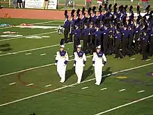 A drum major or field commander is the leader of a marching band, drum and bugle corps, or pipe band, usually positioned at the head of the band or corps. The drum major is often dressed in more ornate clothing than the rest of the band or corps and is responsible for providing commands to the ensemble, leading them while marching, and directing them what to play, when to play, the dynamic or volume of playing, and what time to keep. The commands may be given verbally, through hand gestures, using a whistle or a baton, or with a mace. Although the drum major is the one conducting for the entire band to see and watch to keep time, the drum major is actually looking at the center snare's feet to keep time. The center snare is the leader of the drumline, and is the one who keeps the band in time while marching. They usually play, tap and/or rolls to set the tempo of how fast the band marches.