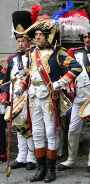 The insignia of appointment is four large point-up chevrons worn on the uniform sleeve, or four point-up chevrons worn on a wrist-strap whilst in shirt-sleeve order, surmounted by a drum. In the British Army, staff sergeants/colour sergeants have a small crown above the drum, whilst warrant officers class 2 have a larger crown and warrant officers class 1 wear the royal arms as usual.[3] Since the drum major is part of the battalion staff, he wears a crimson sash instead of scarlet, and dresses as a warrant officer regardless of his rank. He is always referred to and addressed as "Drum Major" or "Sir" and not by his rank. In the RAF, a chief technician wears a four-bladed propeller above the drum, a flight sergeant wears a crown, and a warrant officer wears the royal arms.[4] Royal Marines drum majors do not wear any additional badges to indicate specific rank.[5]