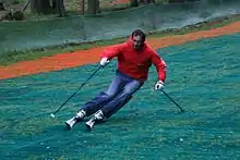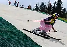 In Chengdu, China, a dry ski mat called a "needle mushroom dry ski mat" has been in use since 2010.[4] It is made of a plastic and aluminum base with many soybean-like beads on the surface. There are more than 20 slopes of needle mushroom dry ski mat, and new dry ski slopes are created each year.[5]