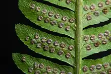 The shapes of fertile (bearing spores and sori) and sterile (lacking spores) leaflets are identical.[3] The sori are typically placed near the midvein and are covered in a smooth, kidney shaped indusium. Each fertile leaflet contains 6–8 pairs of sori which are paired across the midvein. In midsummer the spores turn brown and ripen and are released into the wind.[7]