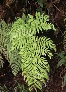 Fronds are clustered, 5–7 per rhizome, erect-arching; stipes (35)49–75 cm long, 4–6 mm in diameter medially, about as long as the blades, adaxially grooved, reddish brown to stramineous, entire length clothed in dense, persistent, spreading, lustrous, light to dark brown or reddish brown, linear-oblong to linear-lanceolate twisted scales to c. 20 × 3 mm, margins entire or subentire and fringed with shortstipitate glands, bases darkened at point of attachment, mixed with smaller bristlelike and hairlike scales, surfaces bearing short, gland-tipped hairs, scales progressively smaller and finer distally and on rachis, stipes of older fronds punctate with dark scale bases; blades thickly chartaceous, dark above green when fresh, paler beneath, 50–100 × 32–66 cm, ovate-deltate, 3-pinnate to 3-pinnate-pinnatifid at least in lower half, distally mostly 2-pinnate-pinnatifid; rachises stramineous to light brown, densely scaly with persistent medium to dark brown, spreading bristlelike scales to 9 × 1 mm, margins entire or with sparse sessile glands, mixed with short glandular hairs, rachises of older fronds punctuate with dark brown scale bases.[1]