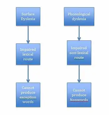 Acquired phonological dyslexia is a type of dyslexia that results in an inability to read nonwords aloud and to identify the sounds of single letters. However, patients with this disability can holistically read and correctly pronounce words, regardless of length, meaning, or how common they are, as long as they are stored in memory.[2][4] This type of dyslexia is thought to be caused by damage in the nonlexical route, while the lexical route, that allows reading familiar words, remains intact.[2]