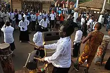 Assemblies, secret societies, and other groups play an important role in keeping the Duala unified, helping them set goals, and giving them a venue to find solutions to common problems.[28] Chief among these is the Ngondo, an assembly of important chiefs. Another of these is the muemba (plural: miemba), a grouping of all Duala of a certain age range or tribal clan. The miemba serve to let their members network and socialise. Other secret societies include the Ekongolo, Jengu, Losango, and Munji.[28]