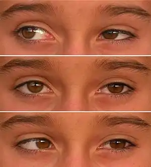 In the clinical setting, the principal difficulties in differential diagnosis arise as a consequence of the very early age at which patients with this condition first present. The clinician must be persistent in examining abduction and adduction, and in looking for any associated palpebral fissure changes or head postures, when attempting to determine whether what often presents as a common childhood squint (note-"squint" is a British term for two eyes not looking in the same direction[11]) is in fact Duane syndrome. Fissure changes, and the other associated characteristics of Duane's such as up or down shoots and globe retraction, are also vital when deciding whether any abduction limitation is the result of Duane's and not a consequence of VI or abducens cranial nerve palsy.
