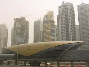 Sobha Realty (Arabic: شوبا العقارية) (formerly Dubai Marina) is a rapid transit station on the Red Line of the Dubai Metro in Dubai. It opened on 30 April 2010 as part of an extension to Ibn Battuta. Dubai Marina station is located near Interchange 5 of Sheikh Zayed Road, around 20 kilometres (12 mi) southwest of Downtown Dubai. It lies to the east of the northern half of the Dubai Marina and to the west of the northern portion of Jumeirah Lake Towers. Dubai Marina station lies on a viaduct paralleling the eastern side of Sheikh Zayed Road. It is categorised as a type 2 elevated station, indicating that there is an elevated concourse between street and platform level. Pedestrian access to the station is aided through walkways above Sheikh Zayed Road, connecting to developments on either side of the road. In September 2014, Damac Properties acquired the naming rights for the Dubai Marina Station, which resulted in it being renamed as the Damac Station.[41]