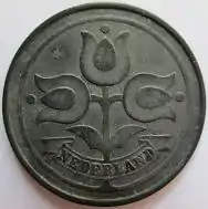 | German occupation coin | Utrecht | Zinc | Three stylized tulips | Value and mint year between two twigs | Reeded with no edge lettering | 1941–1943 |