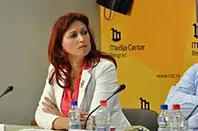 Filipovski resigned from New Serbia in January 2017, saying that she had lost confidence in both Ilić and the party's direction. This occurred after Ilić withdrew support from prime minister Aleksandar Vučić and publicly criticized his administration.[22] A report in Tanjug from this period described Filipovski as having for many years been the only publicly recognizable personality in New Serbia other than Ilić.[23] Two other New Serbia parliamentarians, Mladen Grujić and Dragan Jovanović, also left the party in this period due to disagreements with Ilić. All three initially served as independents and continued to support Vučić's administration. Filipovski joined the Progressive Party on 17 November 2017.[24]
