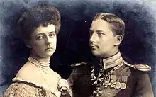 In June 1905, Sophia Charlotte first met Prince Eitel Friedrich of Prussia at the wedding of his brother Crown Prince Wilhelm to Duchess Cecilie of Mecklenburg-Schwerin.[6] They were both sons of Wilhelm II, German Emperor and Augusta Viktoria of Schleswig-Holstein. In Kiel later that month, Sophia Charlotte became better acquainted with him.[1] Eitel's mother in particular desired the match, as she wanted her son to marry one of the Oldenburgs (a family considered quiet, inoffensive, and suitable for a prince).[7] The Oldenburgs were also an ancient family with strong ties to both the Empress and Emperor (as Sophia Charlotte's mother had been a Prussian princess). Her family also had other strong ties to the Hohenzollerns, as Sophia Charlotte's mother had been a great intimate of the Duchess of Saxe-Meiningen, the Emperor's sister.[3] The Duchess was also Sophia Charlotte's godmother, and Sophia Charlotte was herself a favourite of the Emperor.[3] Her closeness to the Prussian court was so pronounced in fact that it had even sparked some early rumours that she would marry Prince Wilhelm instead.[3] Wilhelm had been allowed to choose however, and had settled on Duchess Cecilie.